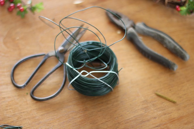 Once you’re happy with the positioning of everything on your wreath, use your wire to secure this into place. I took snipping of wire, fastened them over the leaves, berries etc and then used the pliers to twist the wire tight on the underside of the wreath. And then all you need to do is fasten it to your door!